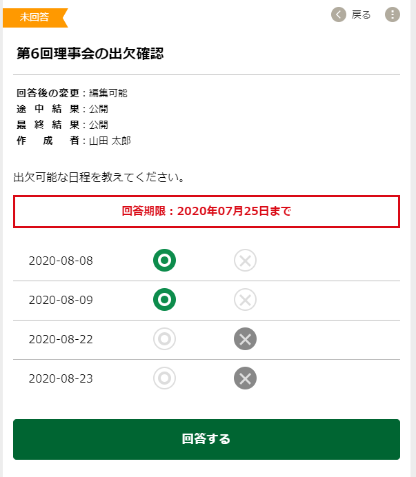出欠確認の詳細画面では、候補日に対して、〇×ボタンで回答します。