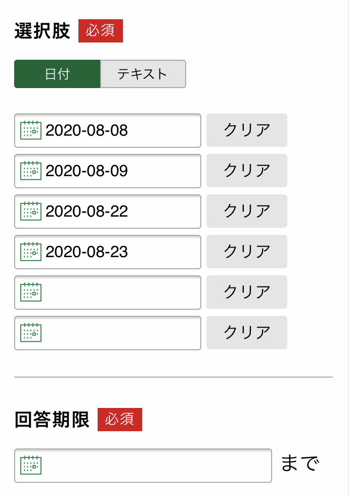 選択肢の項目は、日付だけでなく、テキストでの入力も可能で、最大6件まで候補日を登録できます。