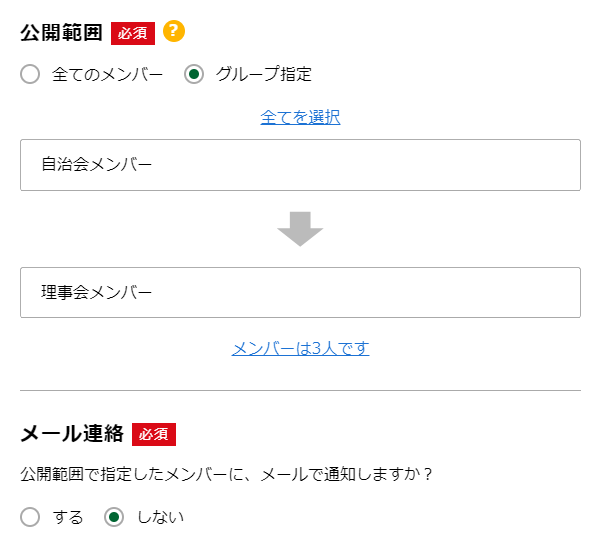 ・公開範囲で「全てのメンバー」もしくは「グループ」を指定します。