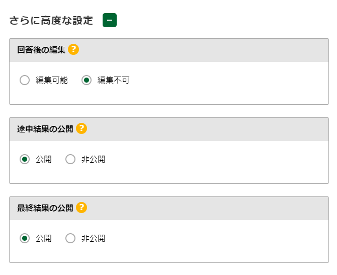 回答後の編集可否、回答結果の公開など、詳細情報を設定することができます。