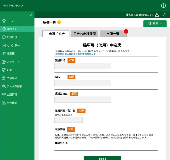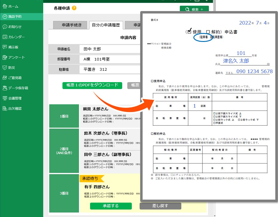 - 駐車場使用申込み、専有部の修繕申請、ペット飼育申請、引越し作業申請、入居届け類などの「申請手続き」をオンラインワークフロー化できます。
