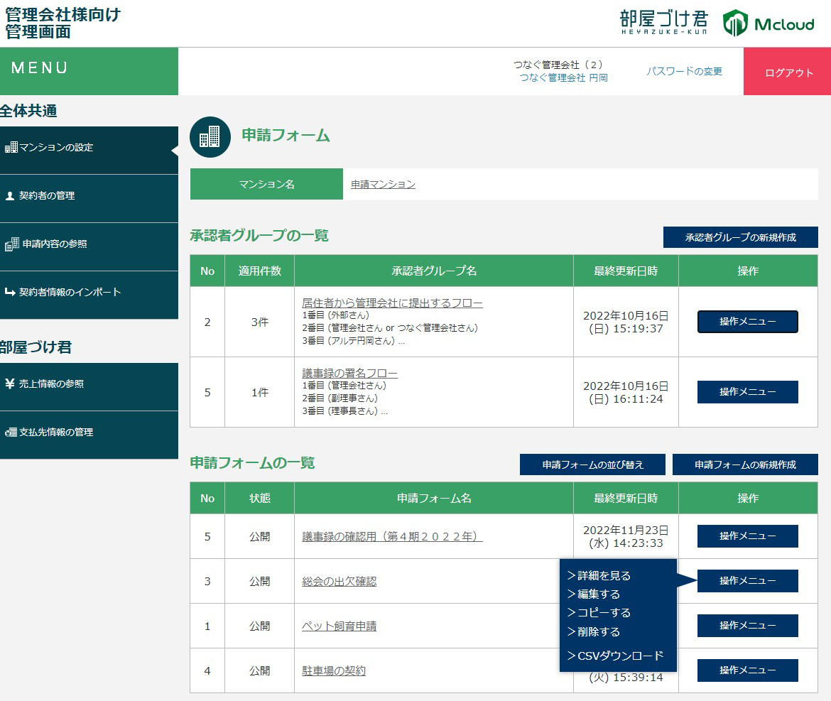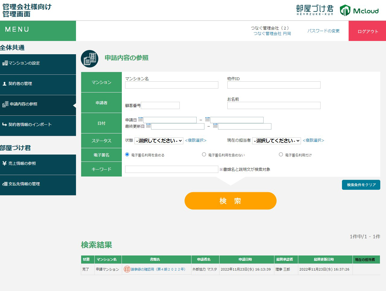 - 管理会社専用の管理画面では、複数マンションからの申請をまとめて検索/確認ができます。