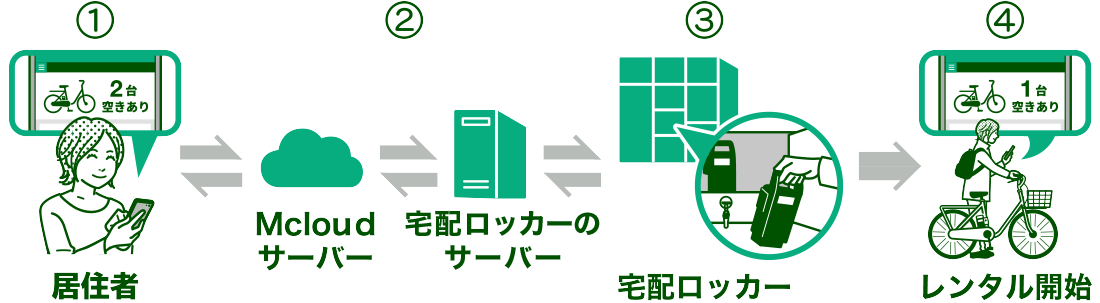 - ①利用者がMcloudからレンタサイクル利用状況を確認。