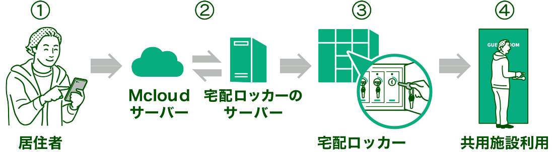 シェアグッズや共用施設の予約情報をMcloudから宅配ロッカーのサーバーへ連携することで、予約者が予約時間内のみ、予約したシェアグッズや施設の鍵を宅配ロッカーから抜き出すことができます。