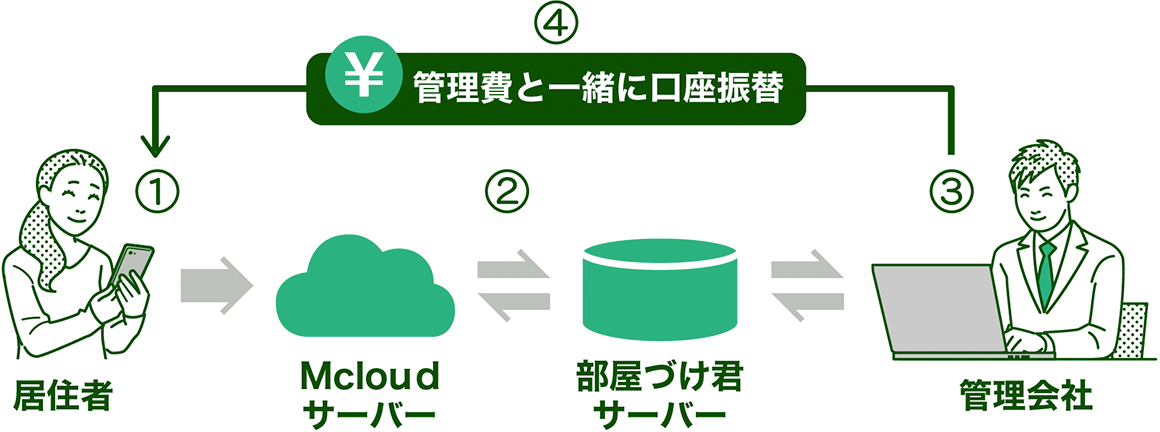 - 居住者様は、ホテルライクな部屋づけ払いでお財布いらず!管理会社様が、施設使用料を毎月の管理費等に合算し、まとめて口座振替します。