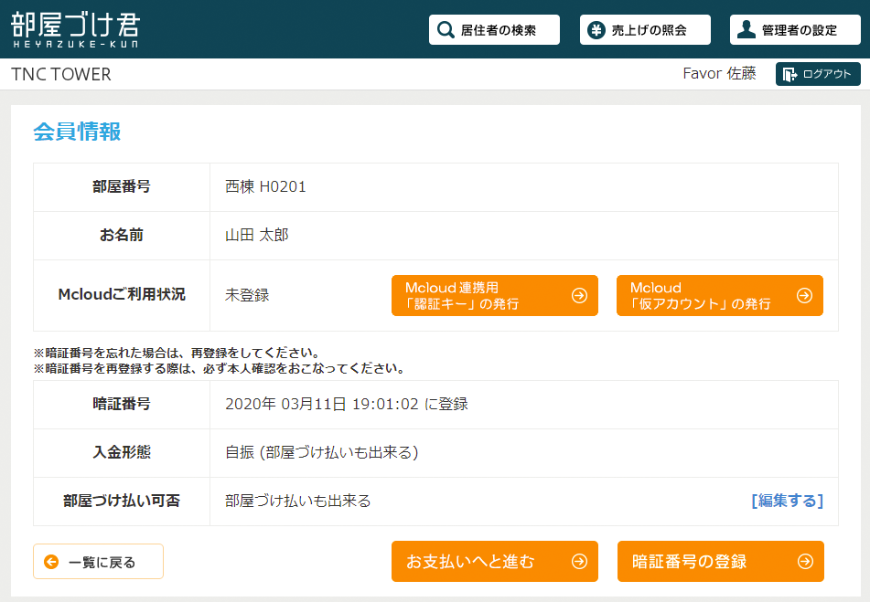 管理者:代理予約はMcloud、支払い手続きは「部屋づけ君」で操作します。