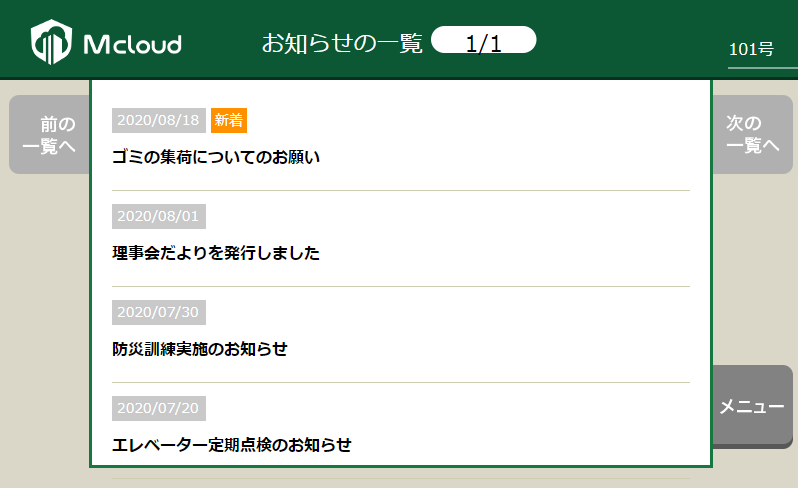 インターホンにMcloudの「お知らせ一覧」を表示したイメージです。