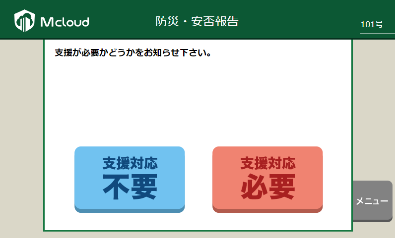 Mcloudの防災機能と連携すれば、居住者は災害発生時にリアルタイムで安否報告ができ、防災対策本部では支援の要否がすぐ判断できます。